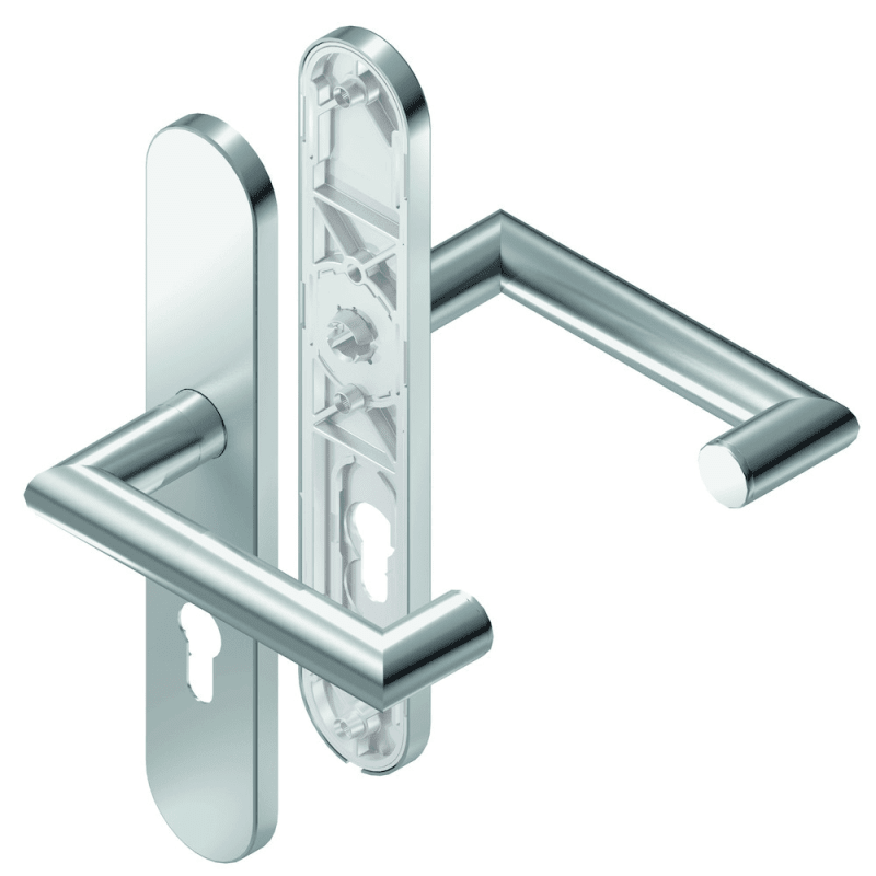 BKS Drückergarnitur BELCANTO-PANIK B-70020; Material: Edelstahl; Befestigungsart: verdeckt verschraubt; Befestigungstechnik: mit Stütznocken; Vierkant: 8 mm; Abdeckung: Langschild; Form: oval; Benutze