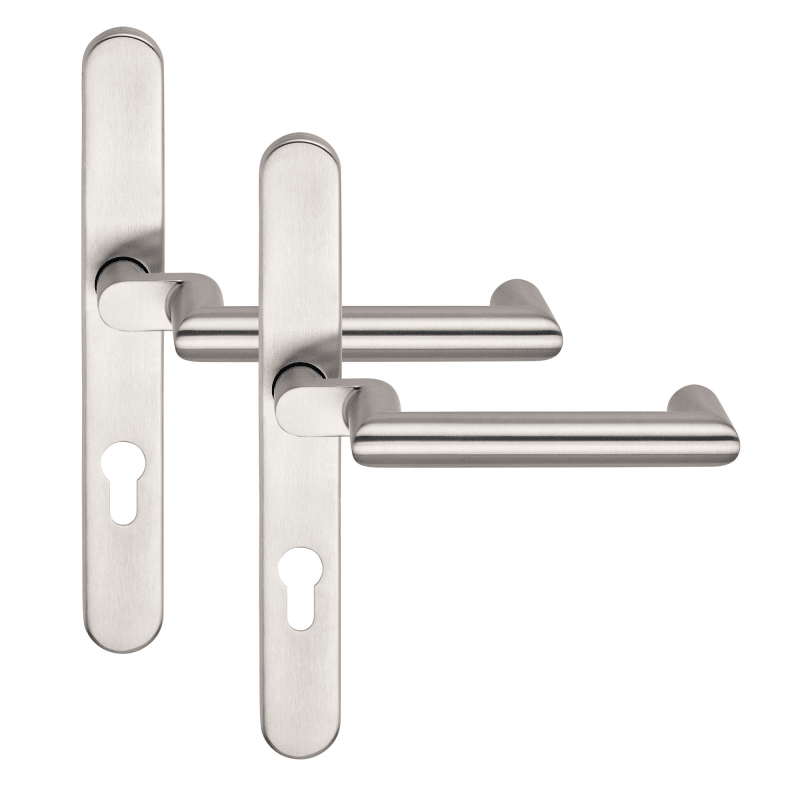 BKS Drückergarnitur BELCANTO-PANIK B-70040; Material: Edelstahl; Befestigungsart: verdeckt verschraubt; Befestigungstechnik: mit Stütznocken; Vierkant: 8 mm; Abdeckung: Langschild; Form: oval; Benutze
