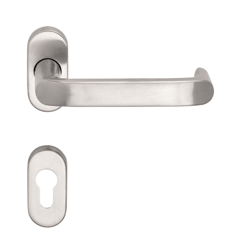 BKS Drücker-Halbgarnitur DIRIGENT B-70130; Material: Edelstahl; Befestigungsart: verdeckt verschraubt; Befestigungstechnik: ohne Stütznocken; Abdeckung: mit Rosetten; Form: oval; Benutzerklasse: Klasse 4; Stärke Abdeckung: 9 mm; Einsatzbereich: Objekttür; Basis: Drücker-Halbgarnitur; Lochung: Profilzylinder gelocht; Vierkant: 8 mm; Befestigungssystem: Stiftverbindung; Türstärke min.: 65 mm; Türstärke max.: 80 mm; DIN-Richtung: DIN Links-Rechts; Lagerung: festdrehbar,wartungsfrei; Breite: 32,7 mm; Länge: 70 mm; Oberfläche: matt gebürstet; Farbton: edelstahl; Norm: DIN EN 1906; Türart: Rahmentüren; Drückerbefestigung: Vierkantstift; Anschlagrichtung: Drücker rechts/links verwendbar; Türwerkstoff: Aluminium,Stahl; Drückerhöhe: 70 mm; Drückerlänge: 138 mm; Ausführung: mit Drücker H7.0; Drückerform: U-Form; Drückerdurchmesser: 21 mm