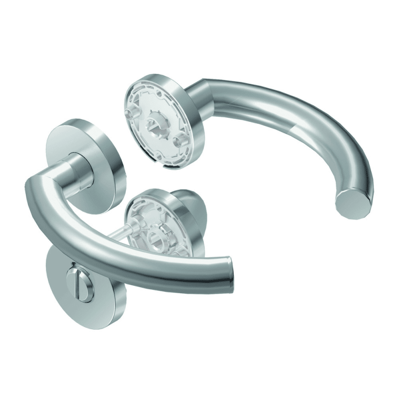 BKS Drückergarnitur OFFICE B-70700; Abdeckung: mit Rosetten; Form: rund; Vierkant: 8 mm; Material: Edelstahl; Befestigungsart: verdeckt verschraubt; Befestigungstechnik: mit Stütznocken; Benutzerklass