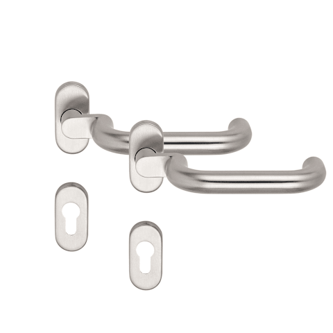 BKS Drückergarnitur RONDO B-72030; Abdeckung: mit Rosetten; Form: oval; Vierkant: 9 mm; Material: Edelstahl; Befestigungsart: verdeckt verschraubt; Befestigungstechnik: ohne Stütznocken; Benutzerklass