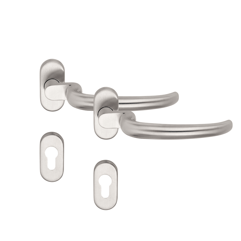 BKS Drückergarnitur TREMOLO B-72030; Abdeckung: mit Rosetten; Form: oval; Vierkant: 9 mm; Material: Edelstahl; Befestigungsart: verdeckt verschraubt; Befestigungstechnik: ohne Stütznocken; Benutzerklasse: Klasse 4; Basis: Drückergarnitur; Ausführung: mit Drücker H6.2; Lochung: Profilzylinder gelocht; Farbton: edelstahl; Oberfläche: matt gebürstet; Anschlagrichtung: Drücker rechts/links verwendbar; Türstärke min.: 65 mm; Türstärke max.: 80 mm; Stärke Abdeckung: 9 mm; Länge: 70 mm; Breite: 32,7 mm; Lagerung: festdrehbar,wartungsfrei; Norm: DIN EN 1906,DIN EN 179,DIN 18273; Zulassung: für Rauchschutz,für Notausgänge,für Feuerschutz; Drückerform: versetzt,gebogen; Drückerdurchmesser: 21 mm; Drückerhöhe: 93 mm; Drückerlänge: 173 mm; Drückerbefestigung: Vierkantstift; Befestigungssystem: Stiftverbindung; Türart: Rahmentüren,Fluchttüren; Türwerkstoff: Aluminium,Stahl; Einsatzbereich: Feuerhemmend; DIN-Richtung: DIN Links-Rechts