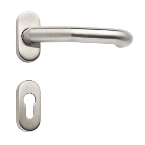 BKS Drückergarnitur RONDO B-72030; Abdeckung: mit Rosetten; Form: oval; Vierkant: 9 mm; Material: Aluminium; Befestigungsart: verdeckt verschraubt; Befestigungstechnik: ohne Stütznocken; Benutzerklasse: Klasse 4; Basis: Drückergarnitur; Ausführung: mit Drücker H1.1; Lochung: Schweizer Rundzylinder gelocht; Farbton: naturfarbig; Oberfläche: lackiert; Anschlagrichtung: Drücker rechts/links verwendbar; Türstärke min.: 65 mm; Türstärke max.: 80 mm; Stärke Abdeckung: 9 mm; Länge: 70 mm; Breite: 32,7 mm; Lagerung: festdrehbar,wartungsfrei; Norm: DIN 18273,DIN EN 179,DIN EN 1906; Zulassung: für Feuerschutz,für Rauchschutz,für Notausgänge; Drückerform: gekröpft,Gehrung,U-Form; Drückerdurchmesser: 21 mm; Drückerhöhe: 70 mm; Drückerlänge: 151 mm; Drückerbefestigung: Vierkantstift; Befestigungssystem: Stiftverbindung; Türart: Rahmentüren,Fluchttüren; Türwerkstoff: Aluminium,Stahl; Einsatzbereich: Feuerhemmend; DIN-Richtung: DIN Links-Rechts