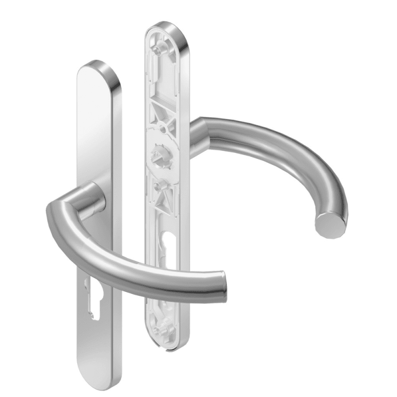 BKS Drückergarnitur OFFICE B-72040; Material: Aluminium; Befestigungsart: verdeckt verschraubt; Befestigungstechnik: mit Stütznocken; Vierkant: 9 mm; Abdeckung: Langschild; Form: oval; Benutzerklasse: