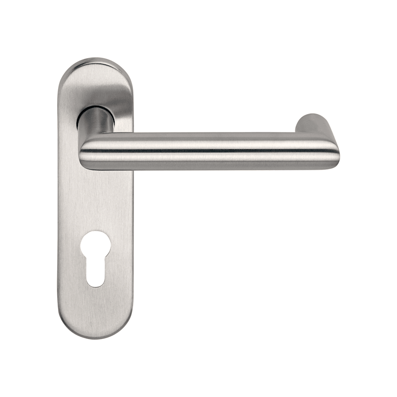 BKS Drücker-Halbgarnitur BELCANTO-PANIK B-72110; Material: Edelstahl; Befestigungsart: verdeckt verschraubt; Befestigungstechnik: mit Stütznocken; Vierkant: 9 mm; Abdeckung: Kurzschild; Form: oval; Benutzerklasse: Klasse 4; Einsatzbereich: Feuerhemmend; Basis: Drücker-Halbgarnitur; Lochung: Profilzylinder gelocht; Entfernung: 72 mm; Befestigungssystem: Stiftverbindung; Türstärke min.: 42 mm; Zulassung: für Feuerschutz,für Rauchschutz,für Notausgänge; Türstärke max.: 52 mm; Anschlagrichtung: Drücker rechts/links verwendbar; Schildstärke: 9 mm; DIN-Richtung: DIN Links-Rechts; Lagerung: festdrehbar,wartungsfrei; Drückerdurchmesser: 21 mm; Breite: 45 mm; Länge: 167 mm; Oberfläche: matt gebürstet; Farbton: edelstahl; Norm: DIN EN 179,DIN 18273,DIN EN 1906; Türart: Fluchttüren; Drückerbefestigung: Vierkantstift; Türwerkstoff: Holz,Stahl; Drückerhöhe: 70 mm; Drückerlänge: 145 mm; Ausführung: mit Drücker H3.0; Drückerform: Gehrung,U-Form