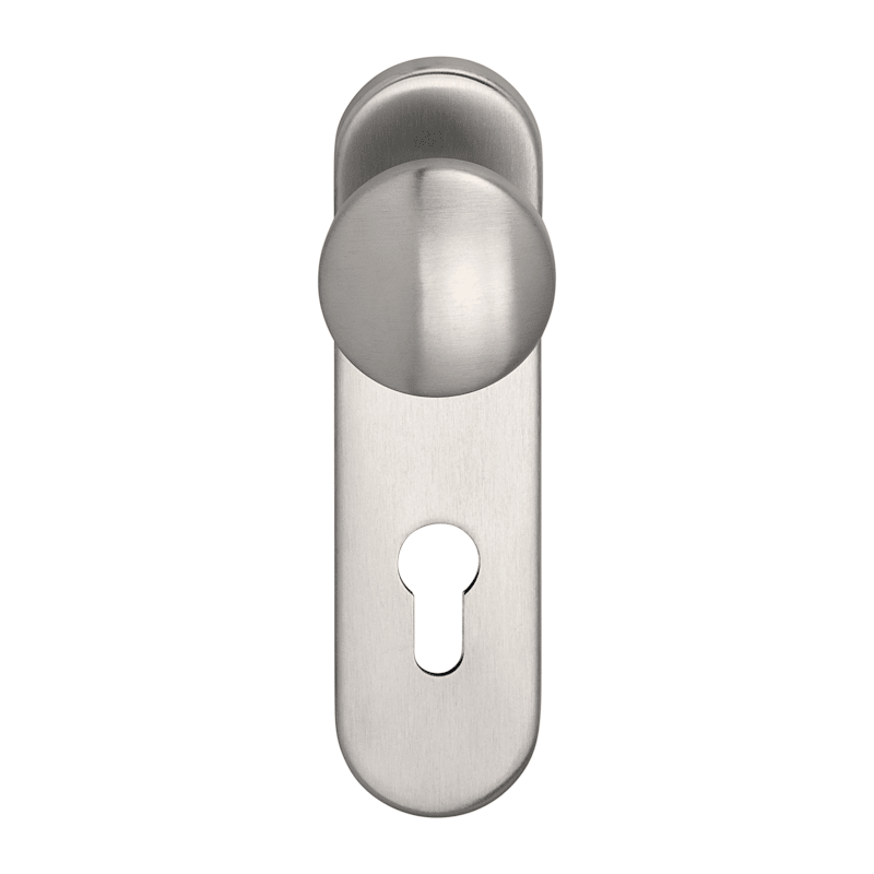 BKS Knopf B-72110; Material: Edelstahl; Befestigungsart: verdeckt verschraubt; Befestigungstechnik: mit Stütznocken; Abdeckung: auf Kurzschild; Form Abdeckung: oval; Lagerung: festdrehbar,wartungsfrei