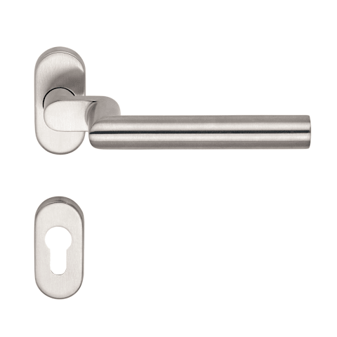 BKS Drücker-Halbgarnitur BELCANTO B-72130; Material: Edelstahl; Befestigungsart: verdeckt verschraubt; Befestigungstechnik: ohne Stütznocken; Abdeckung: mit Rosetten; Form: oval; Benutzerklasse: Klass