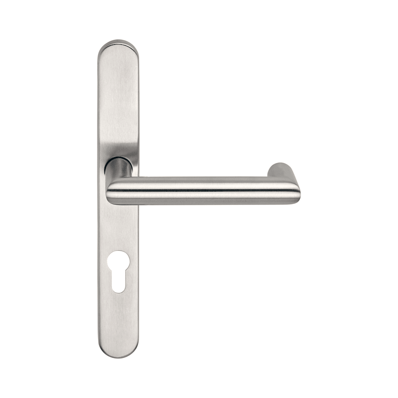 BKS Drücker-Halbgarnitur BELCANTO-PANIK B-72140; Material: Edelstahl; Befestigungsart: verdeckt verschraubt; Befestigungstechnik: mit Stütznocken; Vierkant: 9 mm; Abdeckung: Langschild; Form: oval; Be