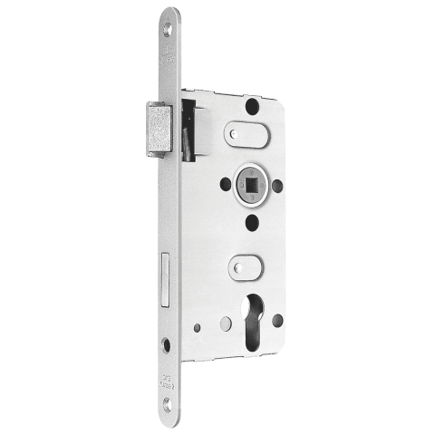 Einsteck-Zimmertürschloss 0415 nach DIN 18251 – Klasse 2. Für leichte Innen­türen, im privaten Wohnbereich. • Stulp nickel-silber lackiert (oder nicht rostender Stahl), • geschlossener Kasten, • Nuss aus Kunststoff mit 8 mm Vierkant, • Zylinderabstand 72 mm, • mit Wechselfunktion, • Falle und Riegel aus Zinkdruckguss.