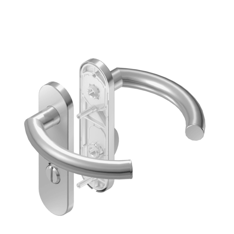 BKS Drückergarnitur OFFICE B-70710; Abdeckung: Kurzschild; Form: oval; Vierkant: 8 mm; Material: Edelstahl; Befestigungstechnik: mit Stütznocken; Befestigungsart: verdeckt verschraubt; Benutzerklasse: Klasse 4; Basis: Drückergarnitur; Ausführung: mit Drücker H4.0,mit Riegelolive R1.0; Lochung: WC Schauscheibe/Schlitzkopf; Entfernung: 78 mm; Farbton: edelstahl matt; Oberfläche: matt gebürstet; DIN-Richtung: DIN Links-Rechts; Befestigungssystem: Stiftverbindung; Drückerbefestigung: Vierkantstift; Drückerform: gebogen; Anschlagrichtung: Drücker rechts/links verwendbar; Türstärke min.: 37 mm; Türstärke max.: 42 mm; Schildstärke: 9 mm; Drückerdurchmesser: 21 mm; Drückerhöhe: 70 mm; Drückerlänge: 150 mm; Einsatzbereich: Zimmertür; Türart: Innentüren; Türwerkstoff: Aluminium,Holz,Kunststoff,Stahl; Modellnummer: B-70710; Modellbezeichnung: Office
