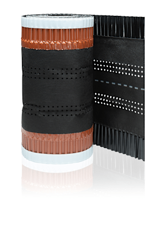 Die blaugelb Firstrolle Alu zeichnet sich durch eine hochwertige Material- und Konstruktionsausführung aus: Ihr Mittelstreifen besteht aus einem beschichteten, alterungsbeständigen Polypropylen-Spinnvlies (PP-Vlies), das seitlich mit robusten Aluminiumstreifen verbunden ist. Diese Aluminiumstreifen sind zusätzlich mit einer widerstandsfähigen, kratzfesten Polyester-Einbrenn-Lackierung versehen und verfügen über einen umgebördelten Rand, welcher während der Montage einen wirksamen Schutz vor Verletzungen bietet. Für sicheren Halt sorgen selbstklebende Butylkautschuk-Streifen an den Außenseiten. Dank ihrer verlängerten und gerafften Plissierung ist die First- und Gratrolle besonders flexibel einsetzbar, selbst auf großdimensionierten First-Dachsteinen sowie bei Dachsteinen mit ausgeprägter, langer Wellen-Tal-Form. Die hohe Plissierung gewährleistet hierbei eine optimale Anpassung an die verschiedenen Dachformen und sorgt für einen dauerhaften, formschlüssigen Sitz. Der offene Lüftungsquerschnitt nach DIN 4108 erfüllt alle Anforderungen an eine fachgerechte Be- und Entlüftung von First- und Gratbereichen bei geneigten Dächern. Die blaugelb Firstrolle Alu lässt sich leicht und schnell auf der First- oder Gratlatte ausrollen, an die individuellen Dachmaterialien anpassen und dauerhaft befestigen. Sie eignet sich für alle gängigen Dacheindeckungen und sorgt damit für eine zuverlässige, langlebige und artungsarme Dachbelüftung.