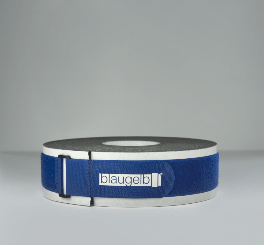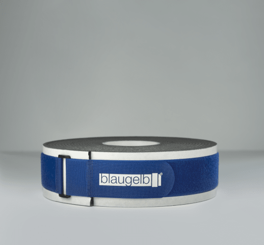 Das blaugelb Gurtband hält angefangene blaugelb Multifunktionsbänder ab einer Bandbreite von min. 30 mm zusammen, die Rollen sind so vor dem ungewollten Expandieren gesichert und bleiben für den nächs