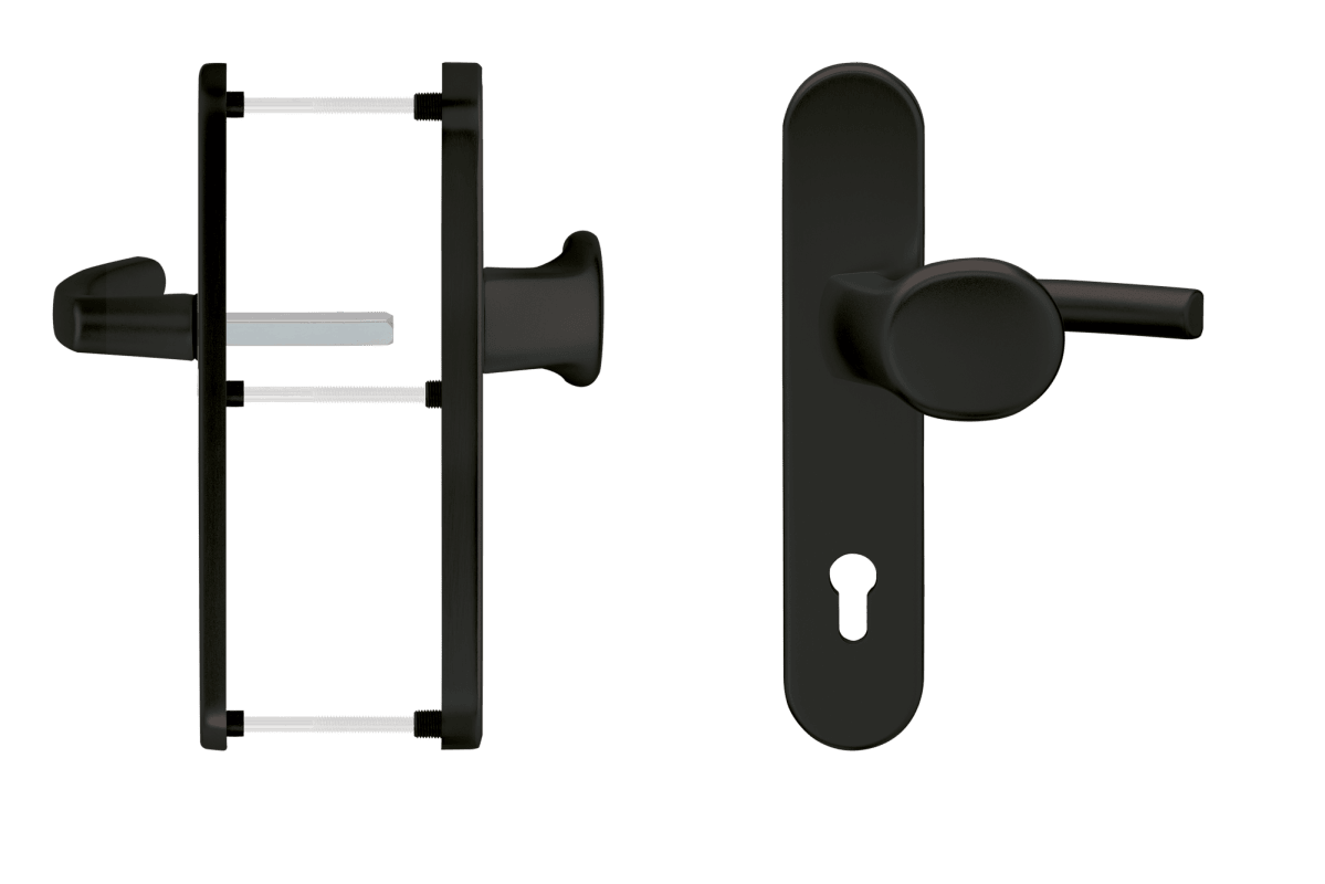 Die blaugelb Wechselgarnitur KGT50 PZ92 Black Line mit einer Schildbreite von 50 mm (Entfernung PZ92) ist geeignet für Holz-, Kunststoff- und Metallaußentüren. Sie ist mit einer Hochhaltefederung zur