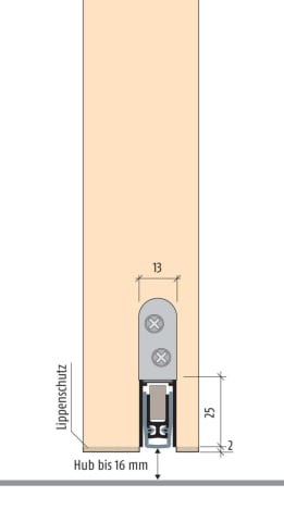 Für Schall- und Rauchschutztüren • Bandseitige Auslösung mit automatischem Ausgleich bei schiefem Boden • Parallelabsenkung • Dichtungshub bis 16 mm • Zum Einnuten bündig oder tiefer, mit Lippenschutz • Lippe aus Silikon, seitliche Befestigung • Profil aus Aluminium 13 x 25 mm. Wichtige Merkmale: Silikonlippe geschützt, da tiefer eingelassen - Einseitige Auslösung mit Parallelabsenkung - Kein Schleifen über den Boden - Automatischer Ausgleich bei schiefem Boden - 48 dB Schalldämmwert (7 mm Bodenabstand) - Kürzbar bis zur nächst kleineren Lagerlänge - Hochwertige Silkonlippe, einfache Hubeinstellung - 5 Jahre Garantie