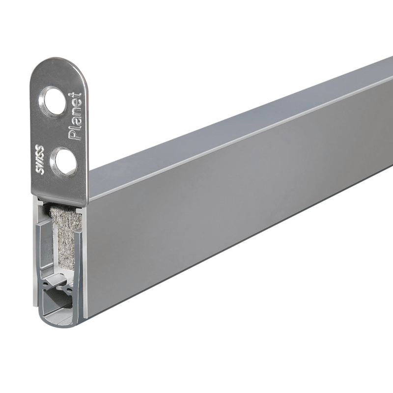Für Schall- und Rauchschutztüren • Bandseitige Auslösung mit automatischem Ausgleich bei schiefem Boden • Parallelabsenkung • Dichtungshub bis 16 mm • Zum Einnuten bündig oder tiefer, mit Lippenschutz