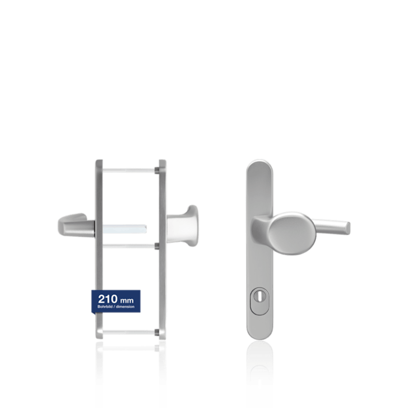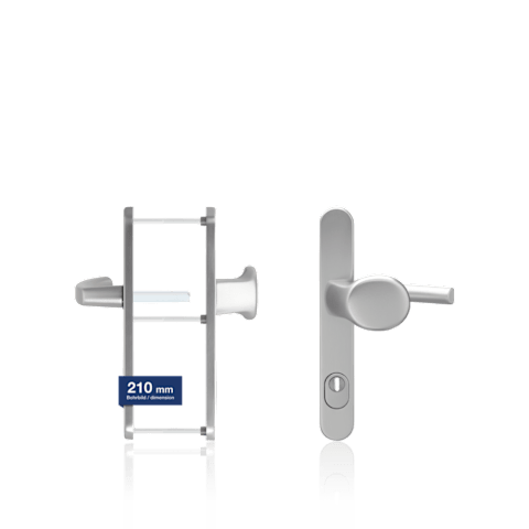 Die blaugelb Wechselgarnitur KGT35/92/210 ZA mit einer Schildbreite von 35 mm (Entfernung PZ92) und einem Kernziehschutz ist für Holz-, Kunststoff- und Metallaußentüren geeignet. Sie ist mit einer Rückholmechanik zur exakten Positionierung des Drückers ausgestattet.