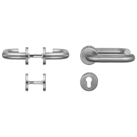 Die formschöne, elegante Drückergarnitur ZT/DGT FS U-Form PZ Klasse 4 ist in Edelstahl fein matt erhältlich. Die Garnitur wird mittels verdeckter, mitgelieferter Verschraubung befestigt.