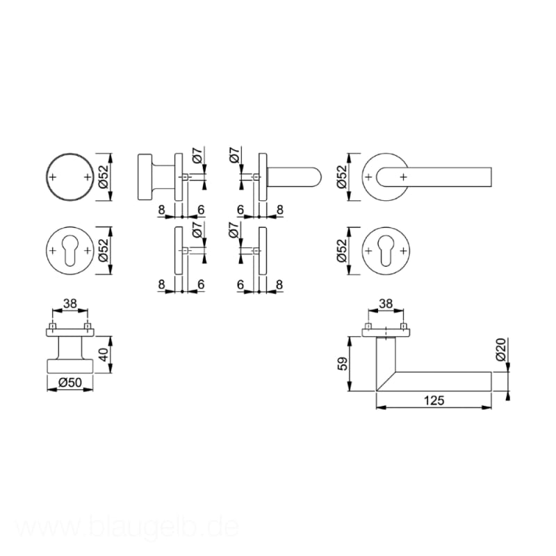Die blaugelb Wechselgarnitur ZT/KGT 90°-Form Klasse 3 ist für Haus- und Wohnungsabschlusstüren mit erhöhtem Anspruch nach DIN EN 1906 für den Objektbereich geeignet und dementsprechend geprüft. Die mitgelieferten Schlüsselrosetten verfügen ebenso wie die Drückerrosetten über Stütznocken zur exakten und dauerhaften Positionierung an der Tür. Durch die eingesetzten Hochhaltefedern ist eine exakte Druckerposition garantiert.