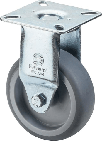 Bockrolle • Gabel aus Stahlblech, verzinkt-chromatiert • Zweireihiger Kugelkranz im Gabelkopf • Lauffläche: thermoplastisches Gummi grau • Radkörper: Kunststoff • Gleitlager