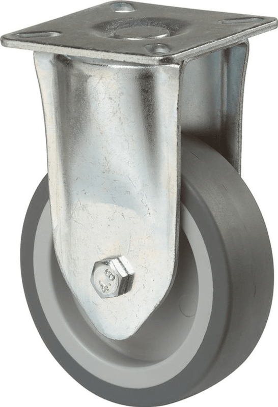 Bockrolle • Gabel aus Stahlblech, verzinkt-chromatiert • Zweireihiger Kugelkranz im Gabelkopf • Lauffläche: thermoplastisches Gummi, grau • Radkörper: Kunststoff • Gleitlager