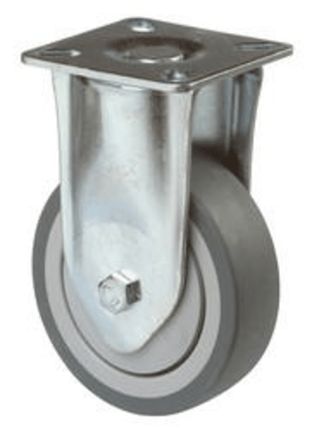 • Gabel aus Stahlblech • Verzinkt-chromatiert • Zweireihiger Kugelkranz im Gabelkopf • Apparaterolle • Lauffläche: Gummi grau • Radkörper: Kunststoff • Lager: Kugellager