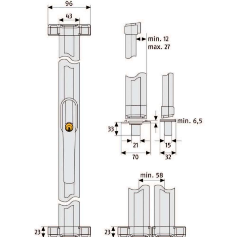Technik und Ausstattung: VdS-anerkannt, DIN-geprüft. Druckwiderstand über 1 Tonne je Sicherungspunkt. Zwei Verriegelungspunkte (oben und unten). Verkrallende Riegel. Riegelstangen sind in verschiedenen Längen erhältlich. Inkl. zwei Schlüssel.