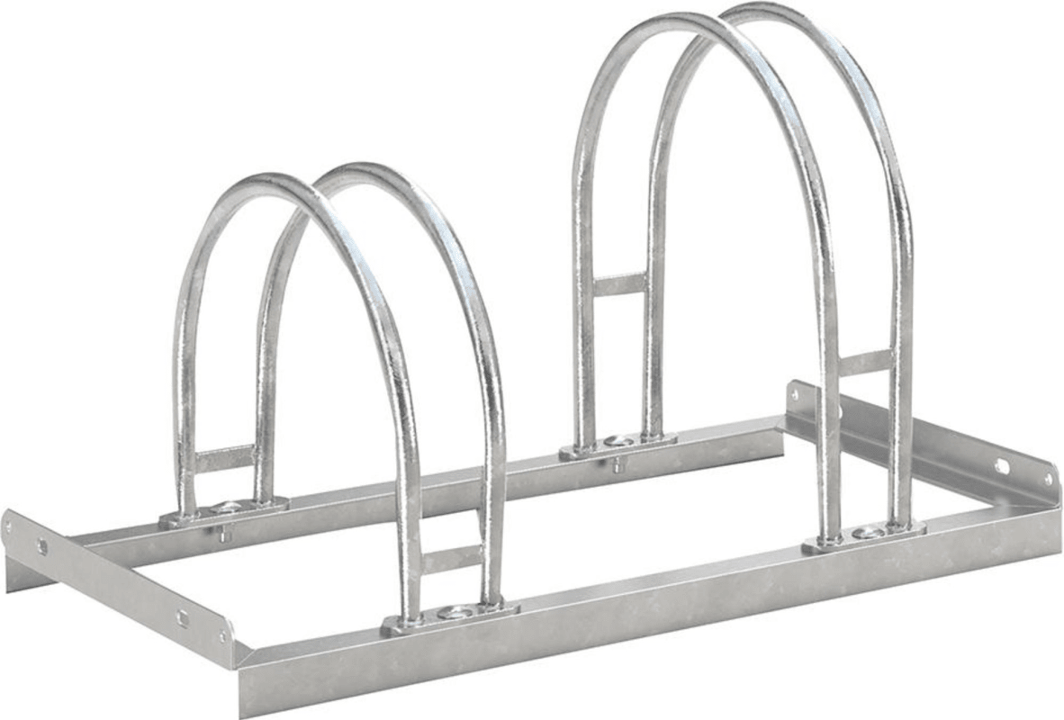 Bogenparker, einseitige Radeinstellung • Platzsparend • Fahrräder können abwechselnd in Tief- und Hocheinstellung abgestellt werden • Material: verzinkter, verschraubbarer bogenförmiger Bügel aus Run