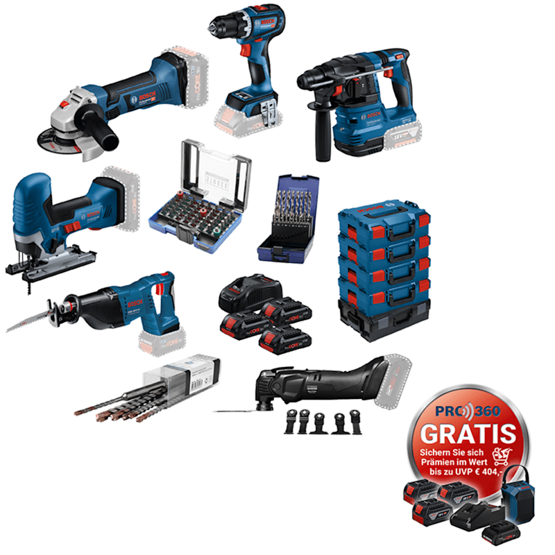 Dieses Set ist für professionelle Anwender im Bau-, Ausbau- und Montagehandwerk konzipiert. Sie arbeiten überwiegend akkubetrieben im 18-V-System von BOSCH Professional und decken Bohr-, Schraub-, Tre