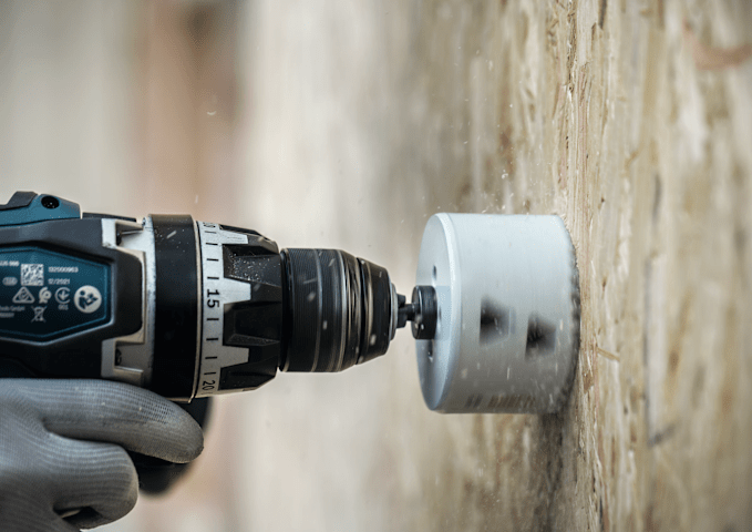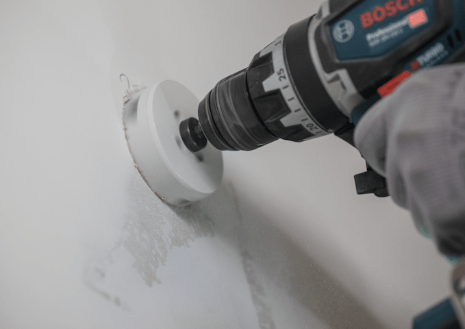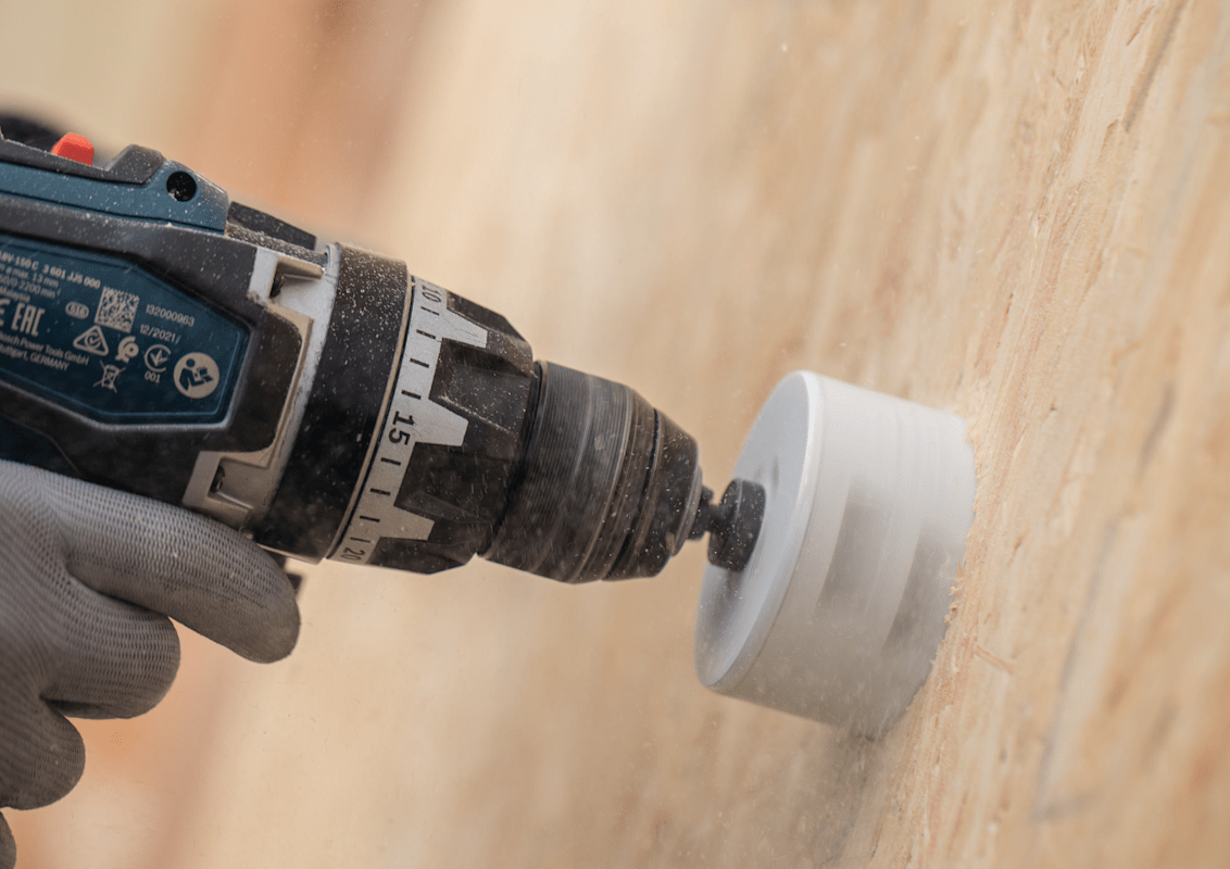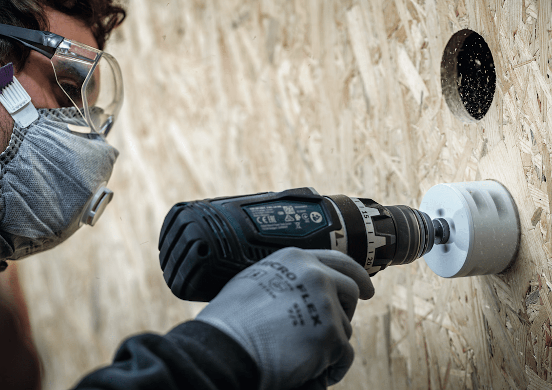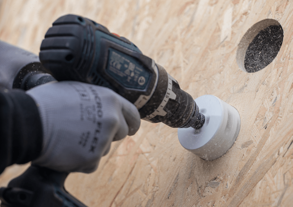 Mit Verwendung einer Lochsäge zum Vorbohren können Löcher schneller erweitert werden. Mit dem Adapter zur Locherweiterung können Sie vorhandene Löcher einfacher als bisher vergrößern. Damit können Sie die vorhandene Bohrung als Orientierung verwenden, wenn Sie sie vergrößern müssen.
