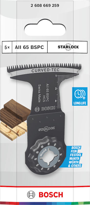 Curved-Tec Blatt für kontrollierte und saubere Tauchschnitte Das AII 65 BSPC Tauchsägeblatt ist ein langlebiges Multifunktionswerkzeug für Profis aus verschiedenen Gewerken, die saubere und präzise b