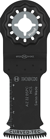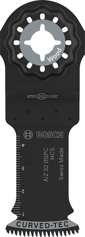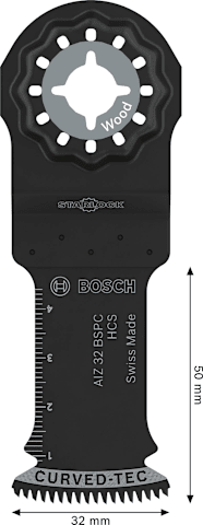 Curved-Tec Blatt für kontrollierte und saubere Tauchschnitte Das AIZ 32 BSPC Tauchsägeblatt ist ein langlebiges Multifunktionswerkzeug für Profis aus verschiedenen Gewerken, die saubere und präzise Tauchschnitte in Hartholz und Weichholz, Platten und Möbelkomponenten ausführen müssen.