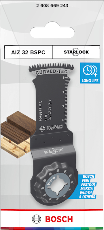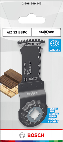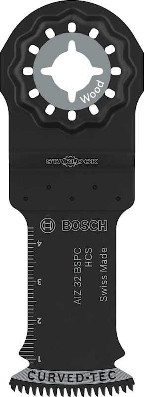 Curved-Tec Blatt für kontrollierte und saubere Tauchschnitte Das AIZ 32 BSPC Tauchsägeblatt ist ein langlebiges Multifunktionswerkzeug für Profis aus verschiedenen Gewerken, die saubere und präzise Tauchschnitte in Hartholz und Weichholz, Platten und Möbelkomponenten ausführen müssen.