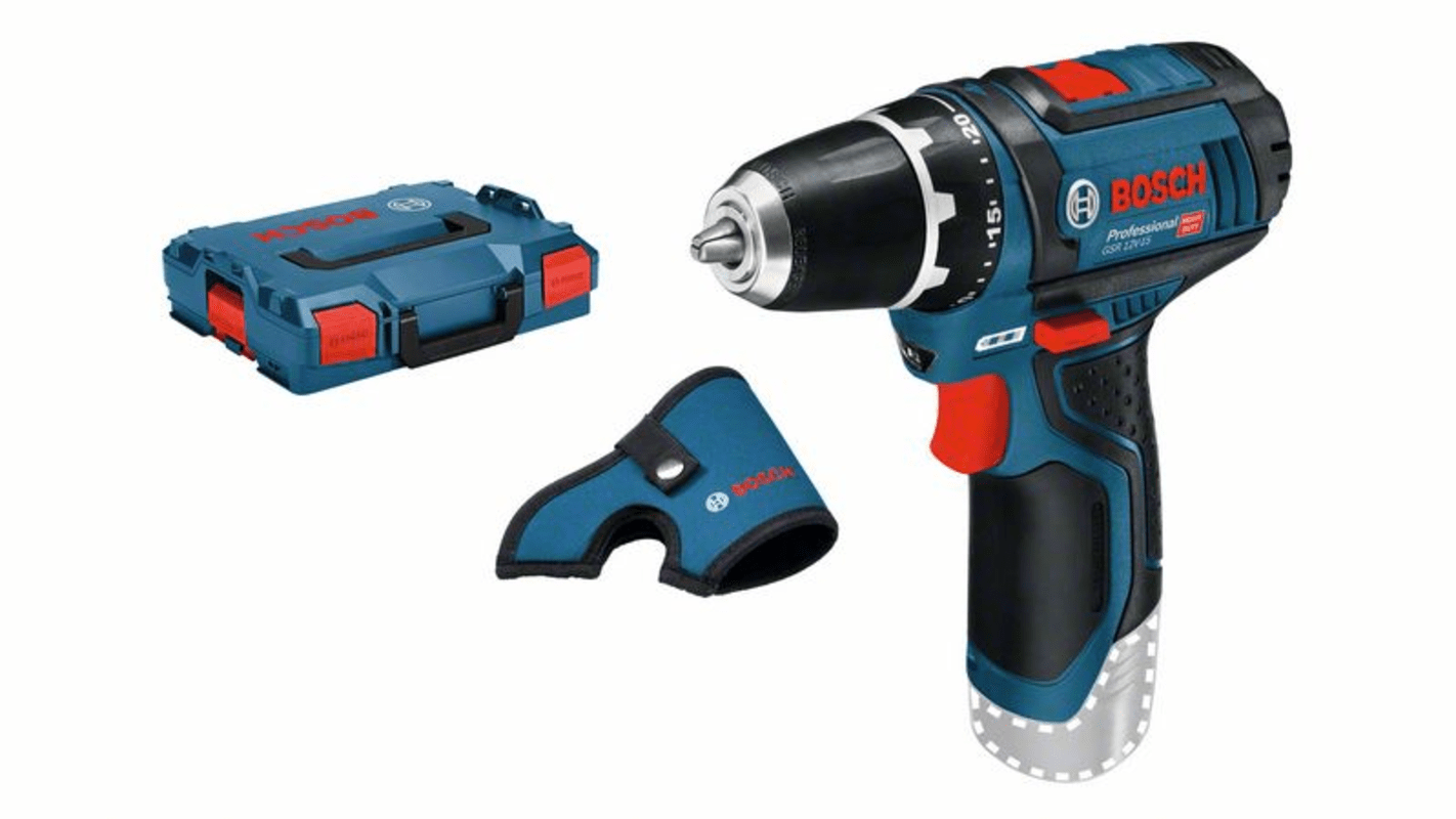 Akku-Bohrschrauber GSR 12V-15, Der Akku-Bohrschrauber GSR 12V-15 Professional bietet in der 12-Volt-Klasse von Bosch ein ausgewogenes Verhältnis zwischen Leistung und Größe. Sein hartes Drehmoment von 30 Nm und 0-1.300 U/min sorgen für das beste Verhältnis zwischen Größe und Leistung. Sein kompaktes Design ermöglicht optimales Handling und ist ideal zum Arbeiten über Kopf und an engen Stellen. Überlastung, Überhitzung und Tiefentladung werden durch die Electronic Cell Protection des Bohrschraubers verhindert. Dieses Elektrowerkzeug wurde zum Bohren in Holz mit einem maximalen Durchmesser von 19 mm, in Stahl bis 10 mm und für Schraubdurchmesser bis 7 mm konzipiert. Das Gerät ist mit allen Bosch Professional 12-Volt-Akkus und -Ladegeräten kompatibel (Professional 12V System). Der GSR 12V-15 Professional verfügt außerdem über 2 Gänge, Autolock, Ladezustandsanzeige, Electronic Motor Protection und Lithium-Ionen-Technologie. L-BOXX 102 (1 600 A01 2FZ); 1/2 L-BOXX-Einlage für Gerät und Ladegerät (1 600 A00 2V2); 1/2 L-BOXX-Einlage für Zubehör (1 600 A00 2WY)