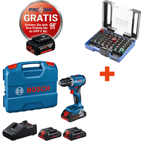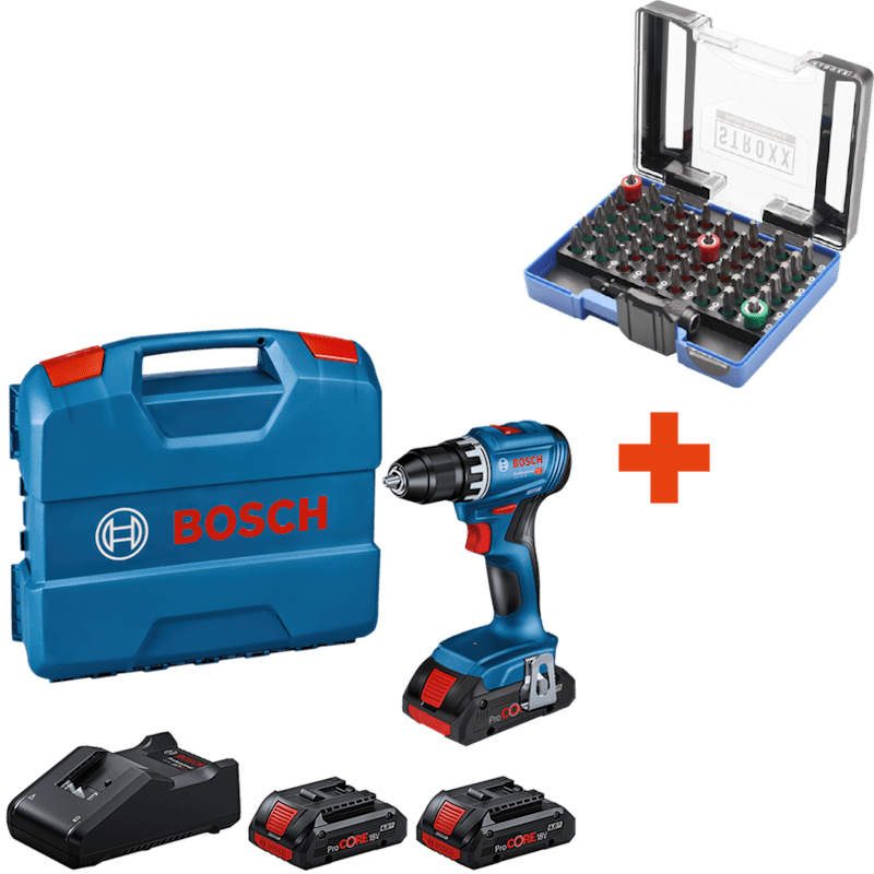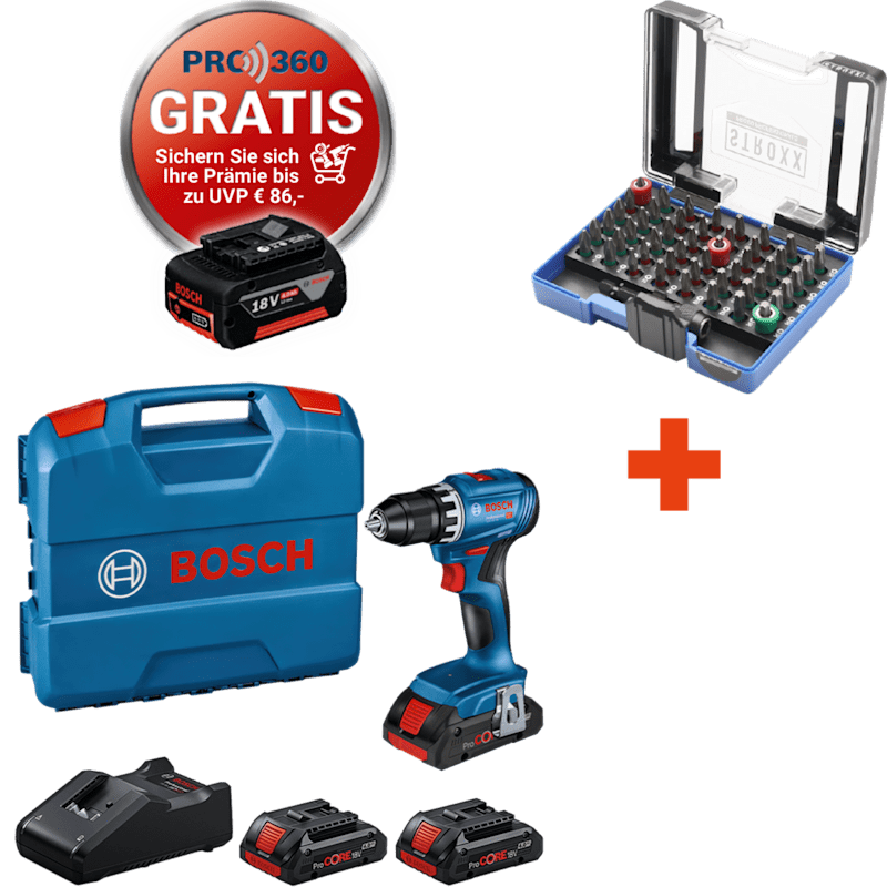Dieses BOSCH Set ist für professionelle Schraub- und Bohrarbeiten im Ausbau, in der Montage und auf der Baustelle ausgelegt. Sie arbeiten mit dem BOSCH Akku-Bohrschrauber GSR 18V-45 aus dem Bosch Professional 18V-System von Bosch. Der bürstenlose Motor liefert konstante Leistung bei kompakter Bauform und ermöglicht präzises Arbeiten auch in engen Einbausituationen. Das robuste 13-mm-Metallbohrfutter sorgt für sichere Kraftübertragung bei gängigen Schraub- und Bohranwendungen in Holz und Metall. Ergänzt wird das Set durch ein STROXX Bit-Set von STROXX mit gängigen Profilen für Serienverschraubungen. Drei ProCORE-Akkus, Ladegerät und Transportkoffer ermöglichen den sofortigen Einsatz im AMPShare-18V-System.