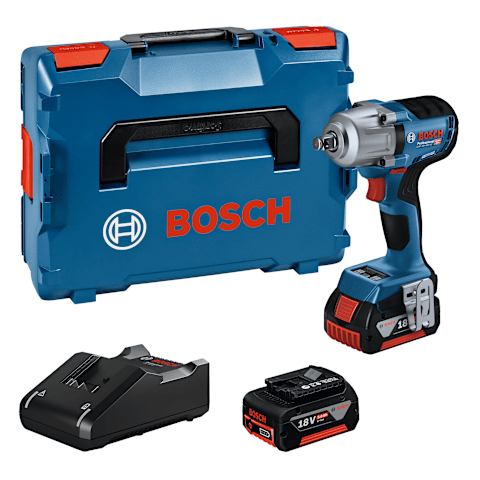 Akku-Drehschlagschrauber GDS 18V-450 HC, Arbeitserleichterung mit dem Akku-Drehschlagschrauber GDS 18V-450 HC Professional. Zwei Standardbetriebsarten am User Interface (Metallsschrauben/Muttern (A) und Holzschrauben (B)) sorgen für eine kontrollierte Anwendung und verhindern gebrochene Schraubenköpfe und den Verlust von Metallschrauben oder -muttern, indem der Drehschlagschrauber verlangsamt oder abschaltet. Jede Betriebsart kann über die Bosch Toolbox App bequem für die jeweilige Anwendung eingestellt werden. Anziehmoment von 450 Nm und Losbrechmoment von 800 Nm liefern Höchstleistung. Höhere Flexibilität und Kontrolle dank drei Geschwindigkeits-/Drehmomentstufen. Der Drehschlagschrauber ist ideal für Metallwerkstätten/Schlosser, Industriemontage, Rahmenbau und Fahrzeuginstandhaltung bei der Verwendung von Metallschrauben/Muttern von M10 bis M20. Das Gerät ist kompatibel mit allen Bosch Professional 18V-Akkus und -Ladegeräten (Professional 18V System). Auch kompatibel mit AMPShare, der markenübergreifenden Akku-Allianz. Der GDS 18V-450 HC verfügt für zusätzlichen Komfort über eine Werkzeugstatusanzeige, ein LED-Licht und einen Gürtelclip. 2 x Akku GBA 18V 5.0Ah (1 600 A00 2U5). Schnellladegerät GAL 18V-40 Professional (1 600 A01 9RJ). L-BOXX 136 (1 600 A01 2G0). 1/1 L-BOXX-Einlage (1 600 A02 DG5)