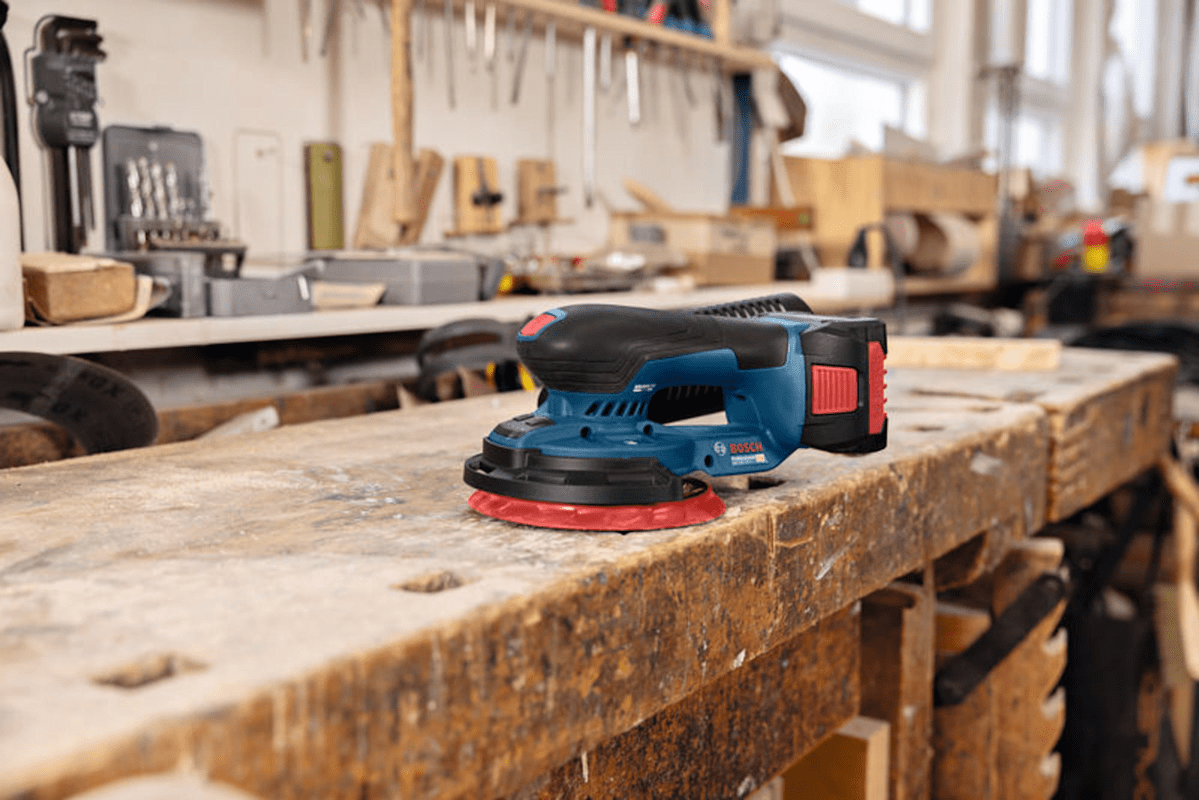 Akku-Exzenterschleifer GEX 18V-150-3, Die hervorragende Balance und der werkstücknahe Griffbereich des Exzenterschleifers GEX 18V-150-3 Professional bieten optimale Kontrolle in allen Arbeitspositionen. Dank seiner hervorragenden Ergonomie lässt er sich leicht mit einer oder zwei Händen verwenden, um die Ermüdung beim Schleifen über einen längeren Zeitraum zu verringern. Dieser Schleifer ist dank seines bürstenlosen Motors und seines 3-mm-Schwingkreises äußerst effizient und bietet hohe Abtragsleistungen. Außerdem entsteht dank der integrierten Venturi-Luftkanäle und der innovativen Staubbox mit integrierter Click&Clean-Schnittstelle deutlich weniger Staub. Dank des HMI ist die Bedienung sehr einfach und intuitiv. Der GEX 18V-150-3 Professional ist ideal zum Entfernen von Holz, Farbe und Lack sowie zum Zwischen- und Feinschleifen von Oberflächen. Er ist mit allen 18V Akkus kompatibel, idealerweise mit ProCORE18V 4.0Ah für eine perfekte Balance. Der GEX 18V-150-3 Professional verfügt über eine Staubbox, Drehzahlvorwahl, Akkustandsanzeige und Schutzring sowie einen 150-mm-Schleifteller. Schleifteller (150 mm) (2 608 001 115). 1 x Schleifblatt C470, Best for Wood + Paint, 120 (separat erhältlich als 5er-Pack: 2 608 901 106). Staubbox (2 608 000 896). Schutzring für 150 mm (2 608 000 895)