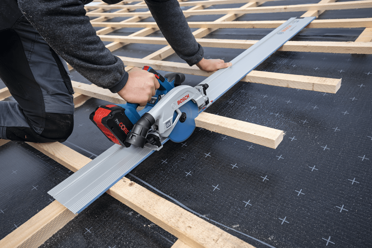 Bei Tischler- und Dachdeckarbeiten oder beim Holzrahmenbau ist eine kraftvolle Kreissäge erforderlich, die genaue Winkelschnitte in allen Positionen durchführt und mit Führungsschienen kompatibel ist. Die präzise Akku-Kreissäge GKS 18V-57-2 GX Professional ist das perfekte Werkzeug hierfür. Diese Säge mit hohem Anwendungskomfort bietet eine Schnitttiefe von bis zu 57 mm und kann Neigungsschnitte bis 50° ausführen. Und sie eignet sich für viele Einsatzbereiche in Kombination mit der Bosch Führungsschiene FSN und dem Führungsschienensystem für Querschnitte FSN X, durch das sie zu einer mobilen Säge für Querschnitte wird. Die GKS 18V-57-2 GX Professional liefert mit ihrem robusten, bürstenlosen Motor maximale Power.