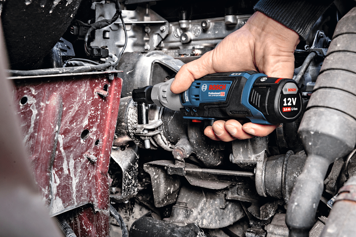 Der Ratschenschrauber GRC 12V-60 3/8 SN eignet sich zum Lösen und Festziehen von Befestigungselementen auf engstem Raum. Er ist mit allen Bosch Professional 12V Akkus kompatibel.