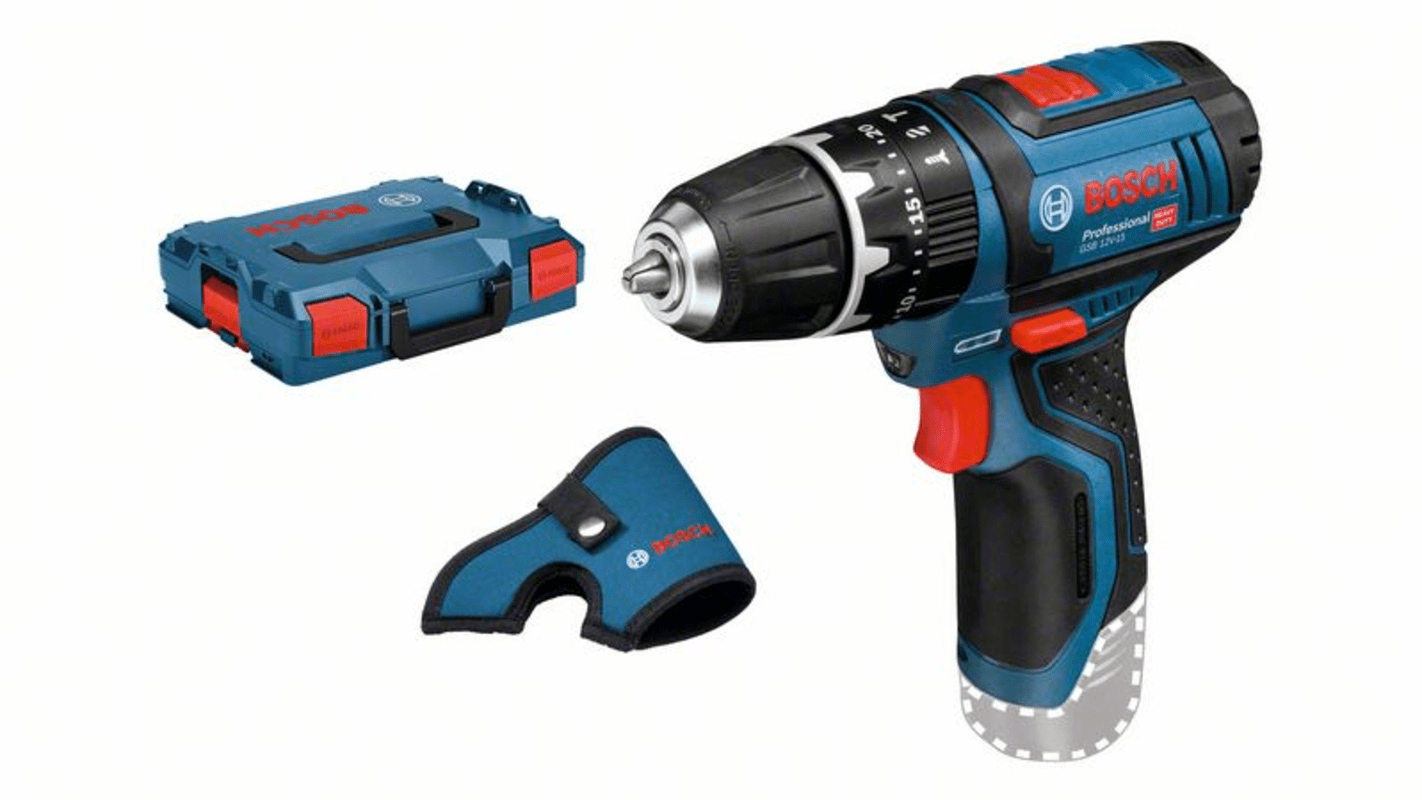 Akku-Schlagbohrschrauber GSB 12V-15, Der Akku-Bohrschrauber GSB 12V-15 Professional mit Schlagbohrfunktion bietet in der 12-Volt-Klasse von Bosch ein ausgewogenes Verhältnis zwischen Leistung und Größe. Mit einem harten Drehmoment von 30 Nm und 0-1.300 U/min bietet der Bohrschrauber eine ideale Kombination aus Leistung und geringer Größe. Sein kompaktes Design ermöglicht optimales Handling und ist ideal zum Arbeiten über Kopf und an engen Stellen. Überlastung, Überhitzung und Tiefentladung werden durch die Electronic Cell Protection des Bohrschraubers verhindert. Die Schlagbohrfunktion dieses Elektrowerkzeugs wurde zum Bohren in Holz mit einem maximalen Durchmesser von 19 mm, in Stahl und Mauerwerk bis 10 mm und für Schraubdurchmesser bis 7 mm konzipiert. Das Gerät ist mit allen Bosch Professional 12-Volt-Akkus und -Ladegeräten kompatibel (Professional 12V System). Der GSB 12V-15 Professional verfügt außerdem über 2 Gänge, Autolock, Ladezustandsanzeige, Electronic Motor Protection und Lithium-Ionen-Technologie. Holster (1 600 Z00 01U); L-BOXX 102 (1 600 A01 2FZ); 1/2 L-BOXX-Einlage für Gerät und Ladegerät (1 600 A00 2UV); 1/2 L-BOXX-Einlage für Zubehör (1 600 A00 2WY)