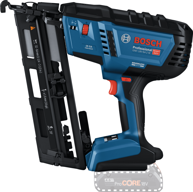 Als professioneller Handwerker willst du Nägel effizient und ohne zu große Belastung für Hand und Arm eintreiben. Wir haben den leistungsstarken, bürstenlosen GNH 18V-64-2 M Professional mit einem sehr geringen Rückschlag entwickelt, der dein Handgelenk schont. Außerdem haben wir darauf geachtet, dass du das Werkzeug einhändig einschalten und bedienen kannst. Dieses Werkzeug bietet die volle Leistung eines Druckluftnaglers, aber frei von Kompressor, Gaskartusche oder Kabel.