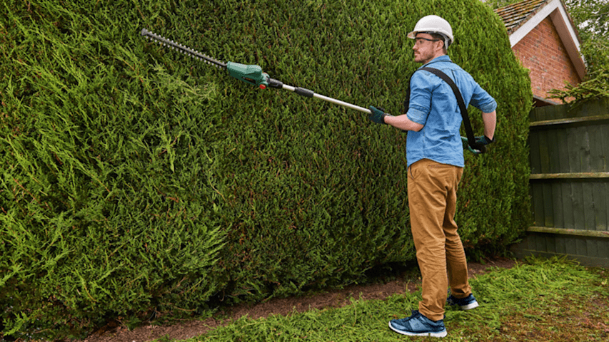 Akku-Teleskop-Heckenschere UniversalHedgePole 18. Ergonomisch geformt zum mühelosen Trimmen hoher Hecken. Höhenverstellbarer Teleskopstiel mit Schwenkkopf für eine bequeme Reichweite von bis zu 2,6 m. Bosch Anti-Blockier-System für eine kraftvolle und kontinuierliche Schnittleistung. Geringes Gewicht (3,6 kg), ergonomisches Design und gute Gewichtsverteilung für höheren Komfort. Perfekte Leistung und Reichweite für müheloses Trimmen hoher Hecken. 43 cm Messerlänge mit 16 mm Zahnabstand. Kartonschachtel