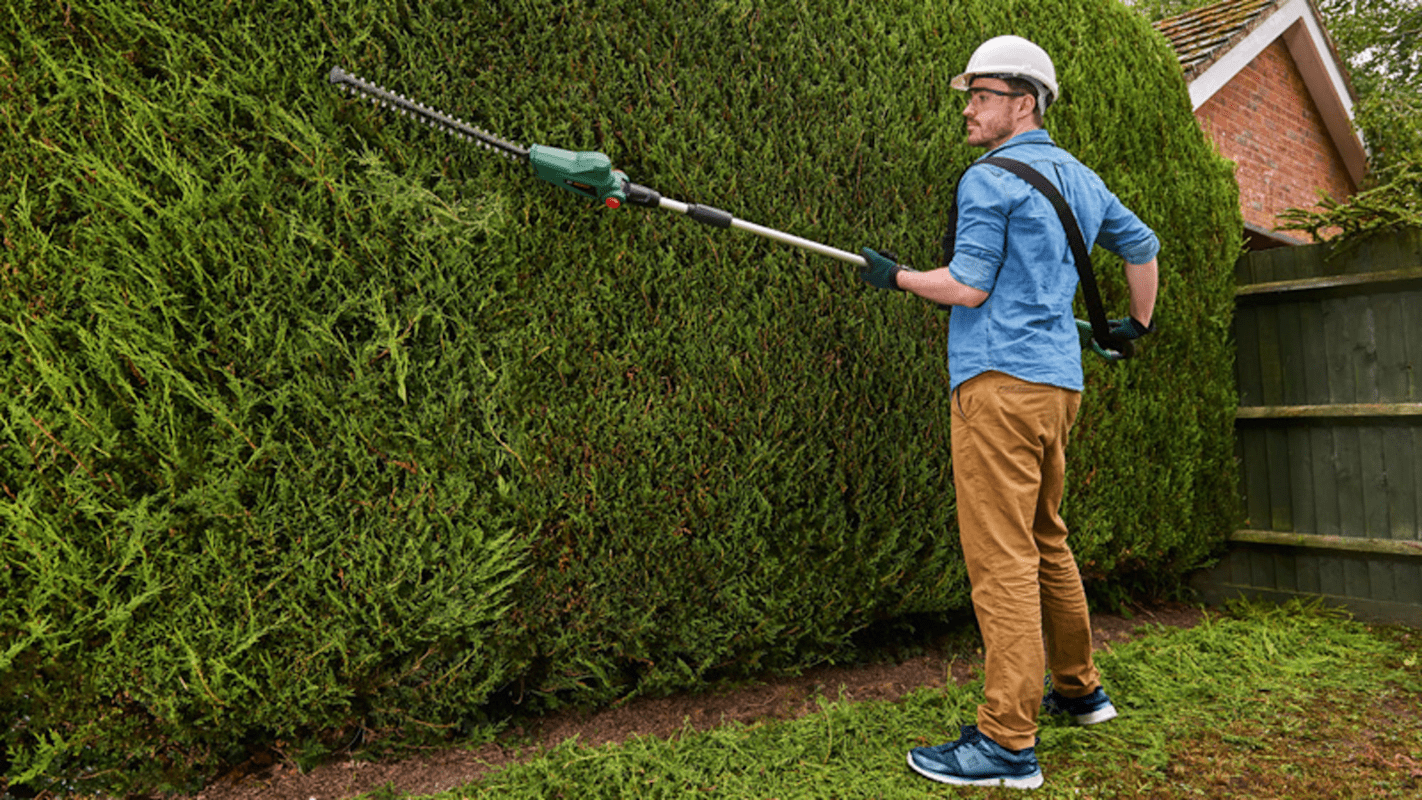 Akku-Teleskop-Heckenschere UniversalHedgePole 18. Ergonomisch geformt zum mühelosen Trimmen hoher Hecken. Höhenverstellbarer Teleskopstiel mit Schwenkkopf für eine bequeme Reichweite von bis zu 2,6 m.