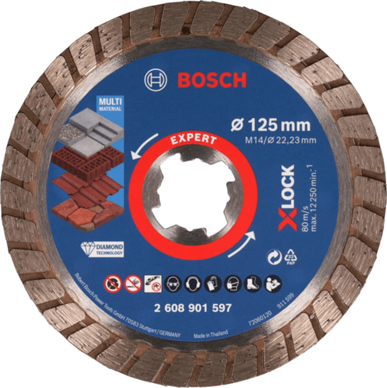 Die Schnittkante dieser EXPERT Multi Material Turbo Trennscheibe vereint die Vorteile von Scheiben mit segmentiertem und durchgehendem Rand und hilft dir dabei, schneller zu arbeiten und dennoch saubere und präzise Schnitte zu erzielen. Die Bosch Diamond Technology – eine Matrix aus Metall und Diamanten – sorgt dafür, dass der Schneidrand stabil ist und nicht reißt oder bricht. Ganz egal, ob du weiche Gehwegplatten, Beton, weiches Mauerwerk oder Dachziegel schneiden musst: Die starke, selbstschärfende Schnittkante hilft dir dabei, die Arbeit zu erledigen.