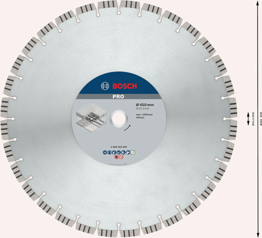 PRO Concrete Diamant-TrennscheibeFür Tischsägen, Für BenzinsägenHält bis zu 1,8x länger als eine Bosch Standard for Concrete TrennscheibeBeton ist aufgrund seiner Zähigkeit und Vielseitigkeit beliebt