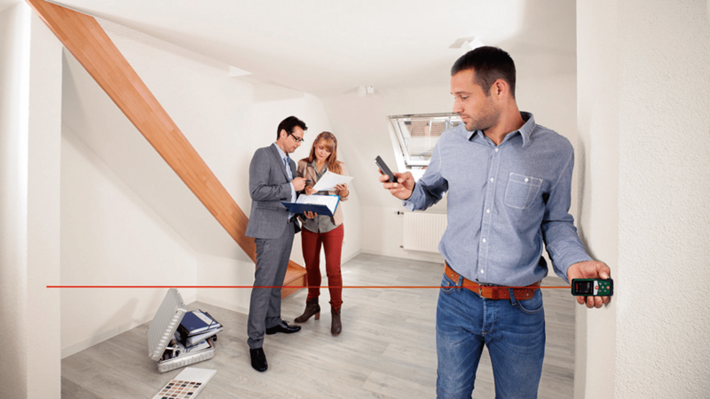 Digitaler Laser-Entfernungsmesser UniversalDistance 40C. Präzises Messen bis zu 40 m und Dokumentation mittels App. Präzises Messen von Entfernungen bis zu 40 m dank Lasertechnologie. Bluetooth-Konnektivität, um die Messergebnisse zur Bosch App zu übertragen. Integrierte Funktionen zur Bestimmung von Entfernungen, Flächen und Volumen. Ideal zur Flächenberechnung, um die nötige Tapeten- oder Farbmenge zu bestimmen. Weitere Funktionen wie Addition/Subtraktion von Messwerten und min/max-Messungen integriert. Produkt mit Nachhaltigkeitsmerkmalen, weitere Informationen siehe unten. 2 x Batterie 1,5V LR03 (AAA). Aufbewahrungshülle. Karton