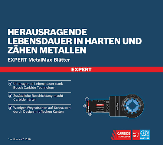Herausragende Lebensdauer in harten und zähen Metallen! Zusätzliche Beschichtung macht Carbide härter Wenn gehärtete Schrauben rosten oder auf andere Weise stecken bleiben, besteht die einzige Option darin, sie flach an der Oberfläche abzuschneiden. Der EXPERT MetalMax macht auch in gehärtetem Metall einen perfekten bündigen Schnitt. Mit seiner herausragenden Langlebigkeit ist es das perfekte Zubehör für Handwerker, die harte Materialien mit einem Multifunktionswerkzeug schneiden möchten. Du hast gesehen, wie mühelos das Multifunktionswerkzeug in und durch Holz sägen kann: Mit dem Bosch EXPERT MetalMax Blatt für Multifunktionswerkzeuge kann Metall genauso zersägt werden. Es sägt sogar mühelos gehärtete Fensterschrauben und Armierungen. Überragende Lebensdauer dank Bosch Carbide Technology