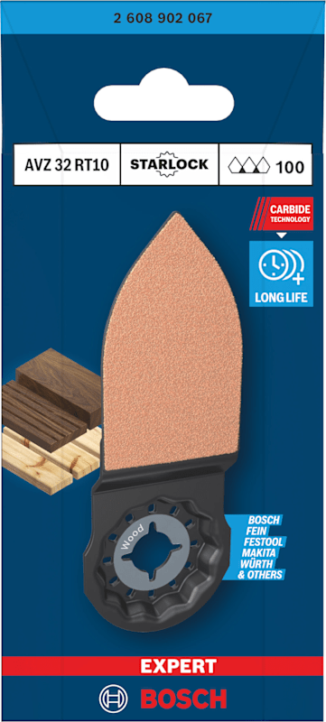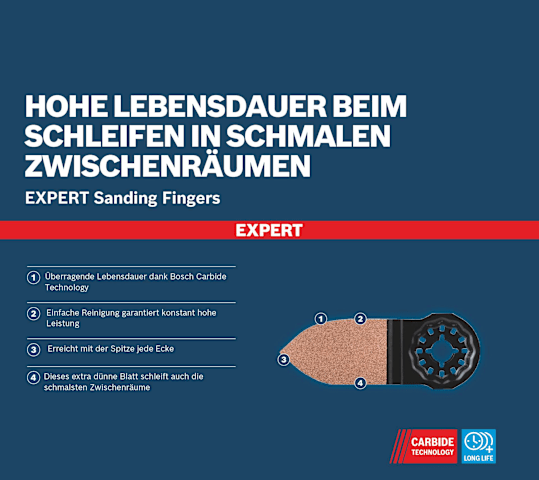 Hohe Lebensdauer beim Schleifen in schmalen Zwischenräumen! Einfache Reinigung garantiert konstant hohe Leistung Enge Zwischenräume in Terrassen, Fensterläden oder alten Treppen lassen sich nur schwer von Hand schleifen. Häufig bekommt man auch einen Splitter in die Finger. Mit dem EXPERT Sanding Finger ist diese Art des Schleifens ganz einfach: Das dünne, spitze Blatt passt in die engsten Räume und schleift schnell und effektiv dank dem hochwertigen Carbide-Korn. Bosch EXPERT Sanding Fingers bieten für alle, die engste Zwischenräume schleifen müssen, eine große Zeitersparnis. Die groben, offen gestreuten Körner des RT4 (Körnung 40) entfernen Material wie Farbe mit minimaler Zusetzung des Sanding Fingers. Überragende Lebensdauer dank Bosch Carbide Technology