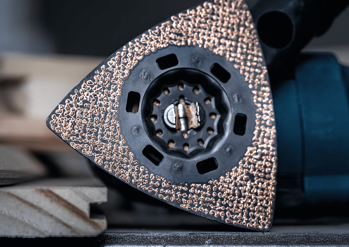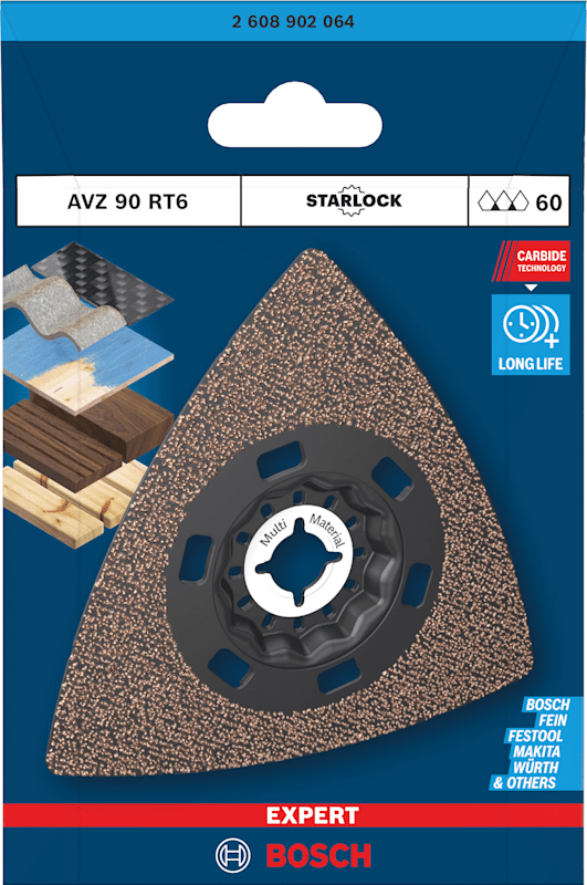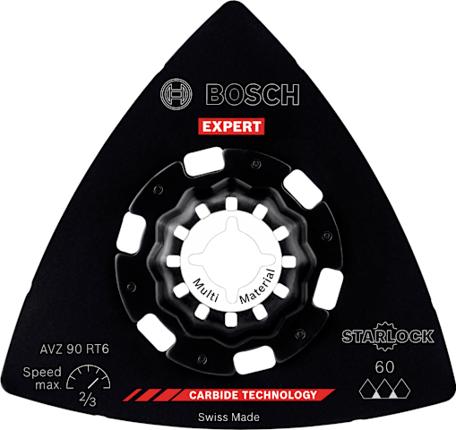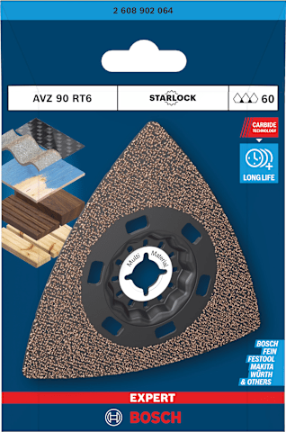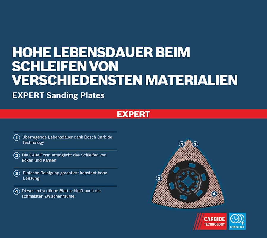Hohe Lebensdauer beim Schleifen von verschiedensten Materialien! Die Delta-Form ermöglicht das Schleifen von Ecken und Kanten Kleine, aber harte Schleifarbeiten zum Entfernen von altem Material und zum Vorbereiten von Oberflächen sind mit herkömmlichen Schleifmaschinen oder von Hand fast unmöglich zu erledigen. Selbst wenn du die Oberfläche erreichen kannst, reißt das Schleifpapier ein. Mit der EXPERT Sanding Plate kannst du jedoch mit deinem oszillierenden Multifunktionswerkzeug Ecken erreichen und schwierige Materialien schleifen. Die groben, offenen Körner des RT2 (Körnung 20) eignen sich am besten zum Entfernen von Mörtel hinter Fliesen, von Teppichkleber oder für die Grobbearbeitung von Holz. Der RT4 (Körnung 40) eignet sich am besten zum Entfernen von dickem Lack, er kann aber auch mit Mörtel und Kleber umgehen. Der RT6 (Körnung 60) ist der Lackspezialist, während der RT10 (Körnung 100) ideal zum Schleifen und Vorbereiten sauberer Holzoberflächen geeignet ist. Überragende Lebensdauer dank Bosch Carbide Technology