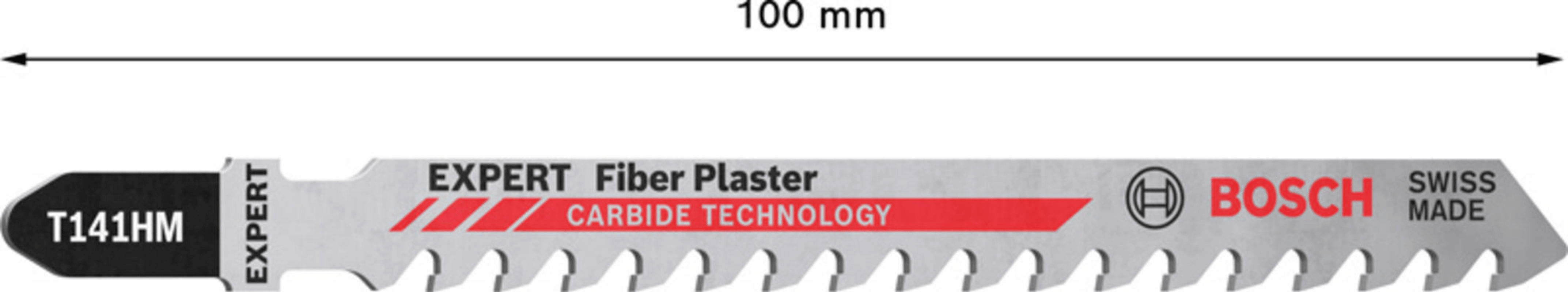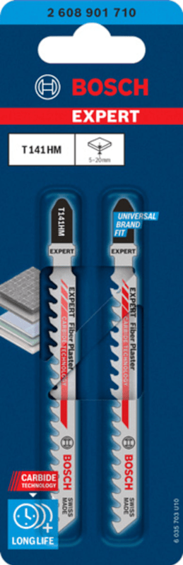 Herausragende Lebensdauer in abrasiven Baumaterialien! Große, konstante Zahnteilung für dicke, zähe Materialien Harte Materialien müssen mit einem robusten Stichsägeblatt bearbeitet werden, die Schnitte müssen aber trotzdem sauber sein. Abgenutzte Blätter erledigen die Arbeit nicht befriedigend. Daher ist das EXPERT ‘Fiber Plaster’ langlebig und qualitativ hochwertig. Seine Carbide-Zähne schneiden die abrasivsten Bauwerkstoffe wie Zementfaserplatten, Gipskartonplatten und glasfaserverstärkte Kunststoffe. Außerdem sorgen sie für maximale Produktivität. Das Bosch EXPERT ‘Fiber Plaster’ Stichsägeblatt wurde entwickelt, um Schnitte in die abrasivsten Materialien zu machen. Das Blatt ist in zwei Längen erhältlich: Das T141HM für maximale Kontrolle und das längere T341HM für dickere Werkstücke. Überragende Lebensdauer dank Bosch Carbide Technology