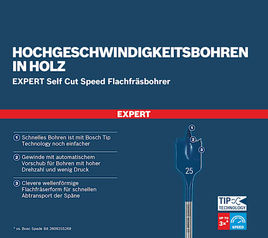 Hochgeschwindigkeitsbohren in Holz! Gewinde mit automatischem Vorschub für Bohren mit hoher Drehzahl und wenig Druck Flachfräsbohrer sind ein großartiges Zubehör für Elektriker und andere Installateure und Bauarbeiter. Was wäre, wenn sie noch schneller und effizienter sein könnten? Mit der Bosch Tip Technology ist dies möglich. Der Bosch EXPERT Self Cut Speed Flachfräsbohrer eignet sich für alle Arten von Weichholz und bietet Effizienz und Komfort für Experten, die Löcher für Kabel, Rohre und andere Installationen bohren müssen. Schnelles Bohren ist mit Bosch Tip Technology noch einfacher